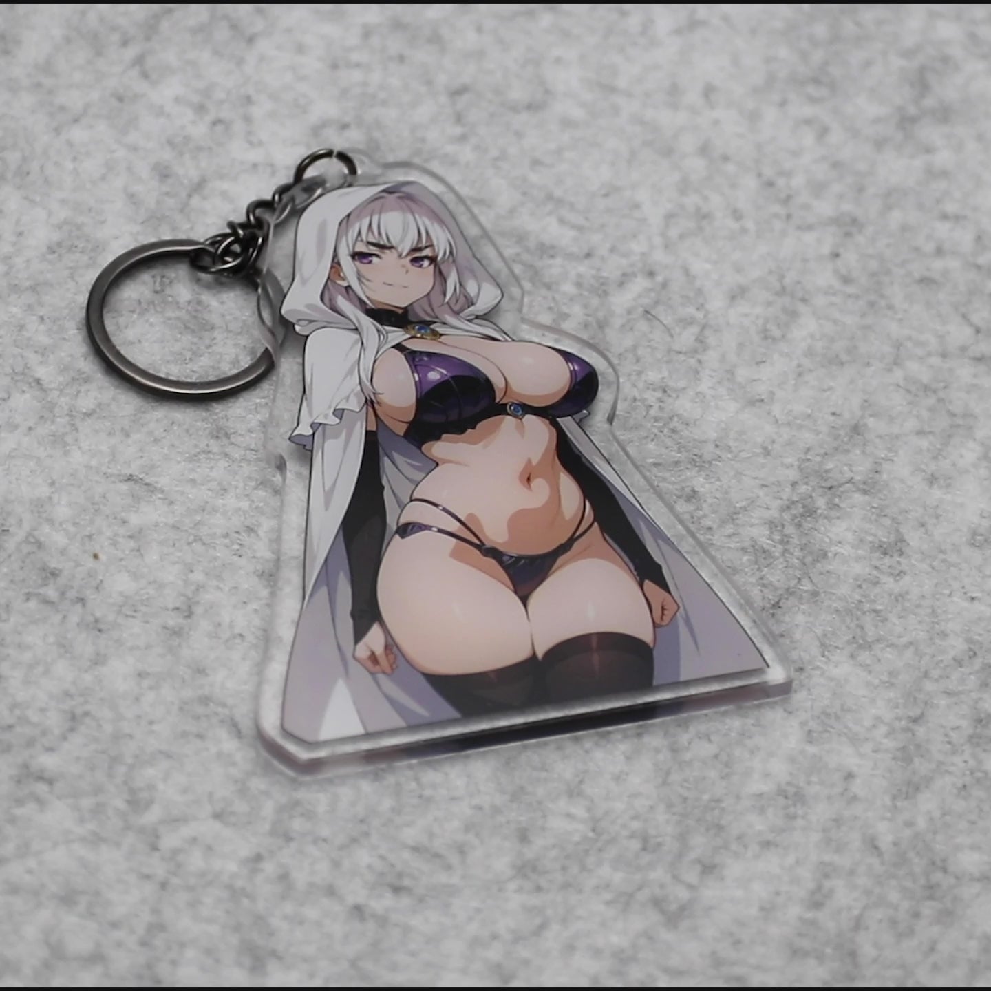 Let her cool confidence and enigmatic allure stay by your side. This 3.5-inch acrylic keychain showcases striking fan art inspired by a silver-haired fantasy heroine, capturing her sharp gaze, bold silhouette, and captivating presence. Elegant yet powerful, this piece blends mystery and strength into a design that instantly stands out.